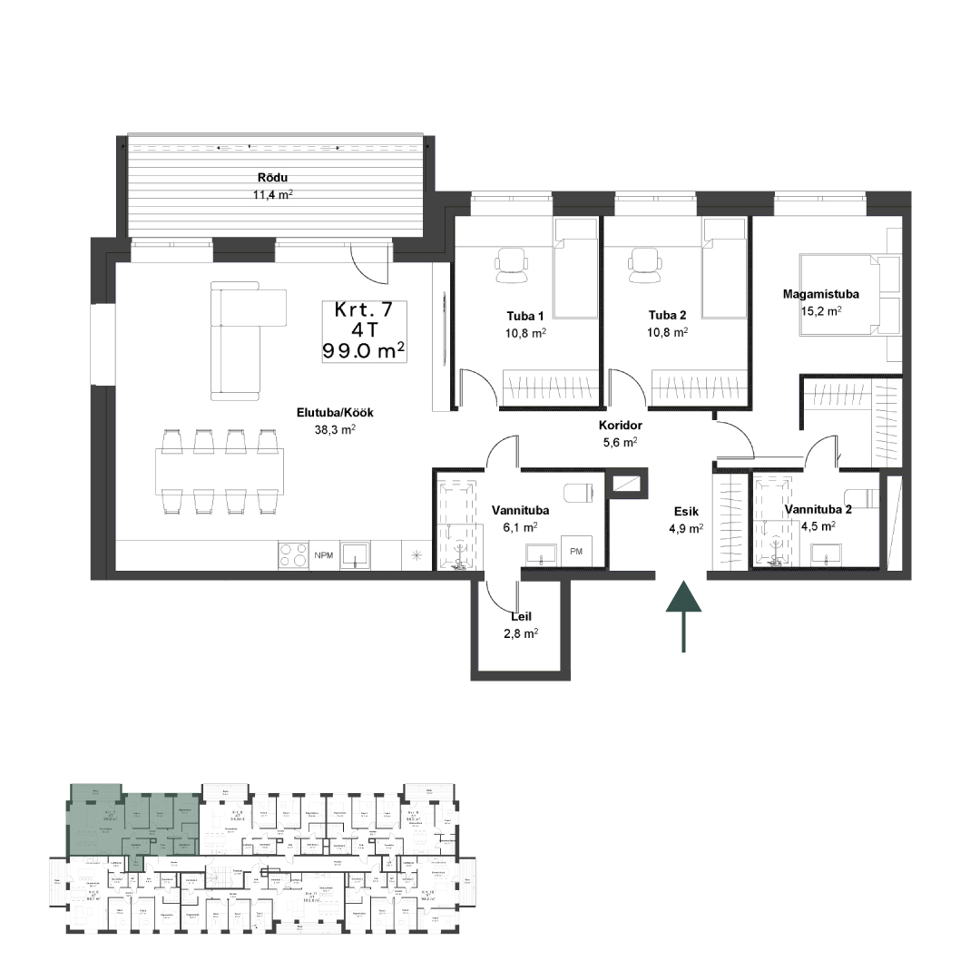 Mugava ja ruumika planeeringuga neljatoaline korter sobib ideaalselt pereeluks. Avar elutuba, eraldatud magamistoad ja nutikad panipaigad loovad funktsionaalse ning kaasaegse elukeskkonna. Iga detail on hoolikalt läbi mõeldud, et pakkuda maksimaalset mugavust ja valgust igasse päeva.
